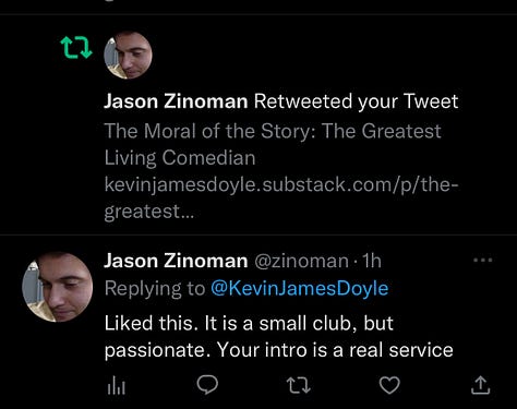 I wrote The Greatest Living Comedian to try to introduce some people to an unknown but brilliant influential comedian. Jason Zinoman a Critic at Large at the New York Times read the piece, retweeted it and said ‘Your intro is a real service’. When I published it I thought it was weird to write fawningly about a fellow comedian but I love his work and I had to publish it to fulfill my self imposed writing goal and deadline for the week. (10 minute listen)